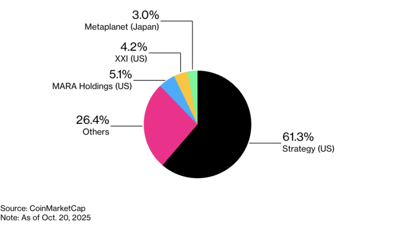 比特幣在10 月6 日創下1,26251 美元的歷史新高,今年以來累計上漲18%。這波漲勢在很大程度上得益於大量專門囤積比特幣的企業的湧現。由邁克爾·賽勒(Michael Saylor)掌舵、市值達700 億美元的比特幣巨頭MicroStrategy 所開創的模式,已經在全球催生了數百家模仿者。這些公司大多的市值超過其持有的加密資產總額,凸顯出投資人的強烈需求。