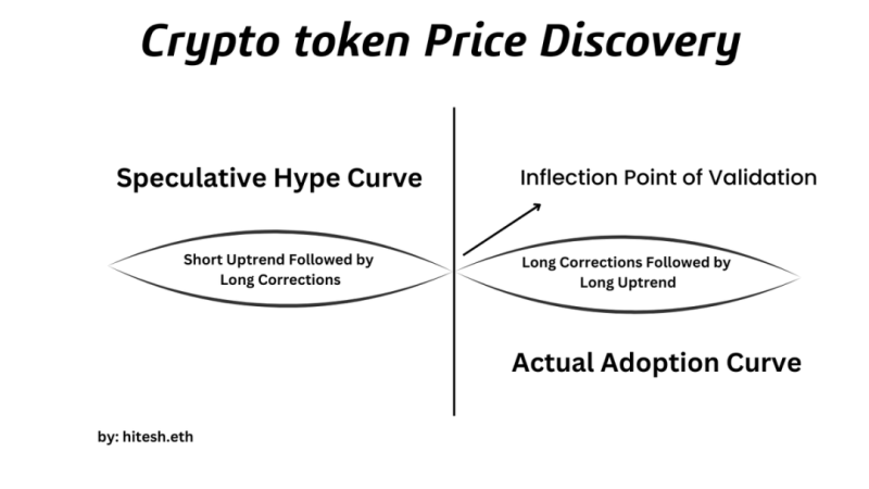 無論宣傳敘事多麼天花亂墜,所有加密代幣都遵循著相同的價格發現週期。週期始於「0-1 階段」:此時炒作佔絕對主導,實際應用率幾乎為零。價格僅憑市場情緒一路飆升,社群圍繞著虛構的「未來藍圖」形成,宣傳話術的聲勢徹底蓋過現實。隨後,殘酷的回檔如期而至—— 這會淘汰掉意志不堅定的持有者,也會揭穿那些只憑一句「承諾」就盲目入場的投資者。