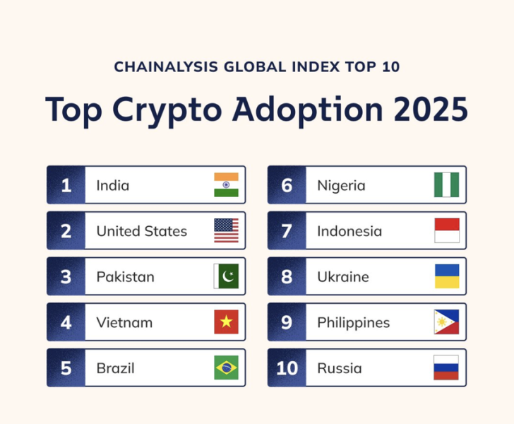 巴基斯坦的加密貨幣故事可以說是從「街頭」開始的。這個國家的加密熱潮並不是政府推動的結果,而是一般民眾自發性的行動。根據區塊鏈數據分析機構Chainalysis 的2025 年全球加密採用指數,巴基斯坦已穩居全球第三,僅次於印度和越南——短短一年,從2024 年的第9 位直接躍升6 位,成為當之無愧的“黑馬”