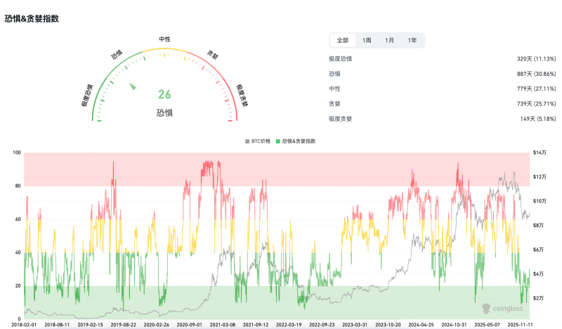 根據 Coinglass 網站資訊,加密市場恐懼與貪婪指數目前為 26,處於恐懼區間;這一區間也是市場情緒佔比最大的階段,整體時間佔比高達 30.86%,較為符合市場走熊的情緒狀態。