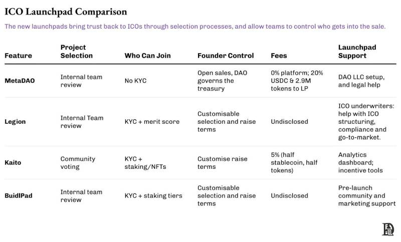 目前,Legion、Buildlpad、MetaDAO 和Kaito 等平台正在湧現,成為新型Launchpad 的代表。第一步是對ICO 專案進行審核,以確保投資者對Launchpad 平台的信任;下一步是審核參與的投資者,以確保資金分配符合專案標準。