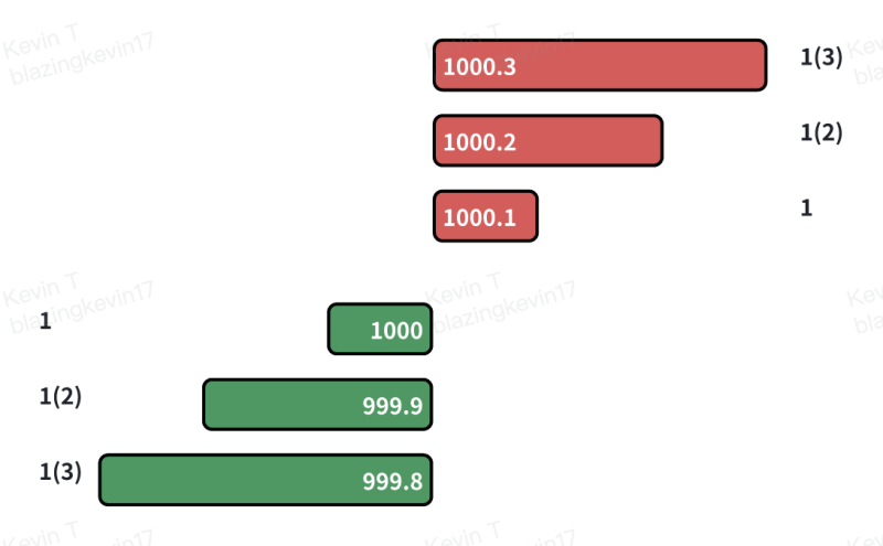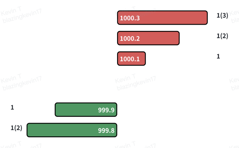 賣盤(Asks) : 密集分佈於$1000.1, $1000.2, $1000.3 等價位。