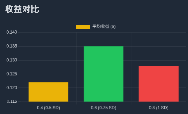 C. 尋找最優解透過對不同價差進行迭代計算,可以發現:價差$0.2 預期收益約$0.08;價差$0.4 預期收益約$0.122;價差$0.6 預期收益約$0.135;價差$0.8 預期收益約$0.128。結論在此模型下,最優價差為$0.6 ,即在距離均價$0.3 (約0.75σ) 的位置掛單,能達到期望收益的最大化。