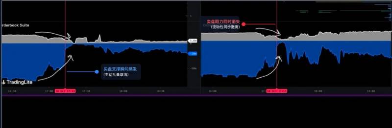買盤支撐的瞬間蒸發:圖表下方的藍色區域出現了一個巨大的、近乎垂直的「斷崖」。這種形態與買單被大量成交所消耗的情況完全不同──後者應呈現出流動性被逐級、漸次侵蝕的形態。而這種整齊劃一的垂直消失,唯一合理的解釋是:大量的限價買單被主動、同時、批量地取消了。