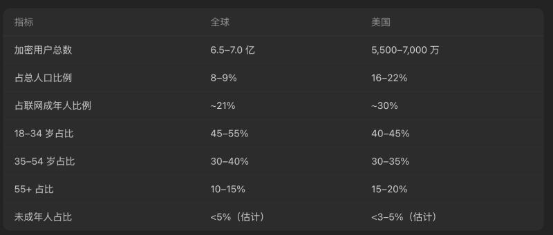 根據現有數據來看,全球範圍內的加密貨幣人群至少在 6.5 億-7 億人以上。這意味著,全球約 8–9% 的人口,或約 20–22% 的觸網成年人持有或使用過加密資產。在美國,這一數字則在 5500-7000 萬人左右,其中:18–34 歲(青年群體)是絕對主力,約 40–45%;35–54 歲(中年群體)約 30–35%;55 歲以上約 15–20%。
