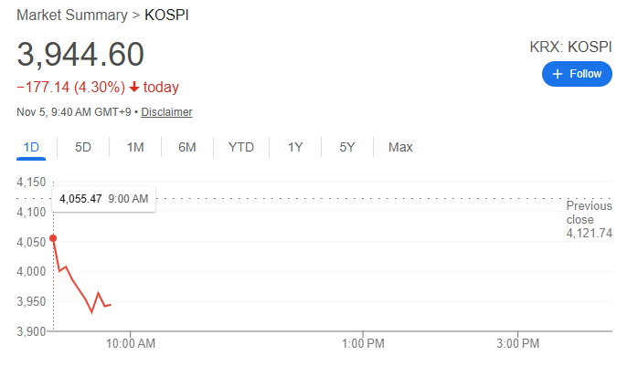 受此影響,亞洲股市開盤走低,韓國股市跌幅一度超過4%。此前,MSCI全球股票指數已錄得近一個月來的最大單日跌幅。