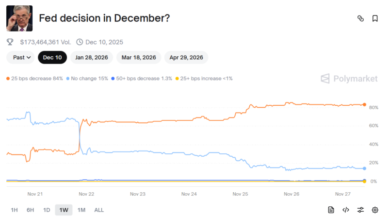 目前,Polymarket 上市場押注聯準會12 月降息25 個基點的機率為84%,不降息的機率為15%。