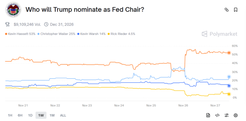 Polymarket 上數據顯示,市場押注哈塞特的機率為53%。