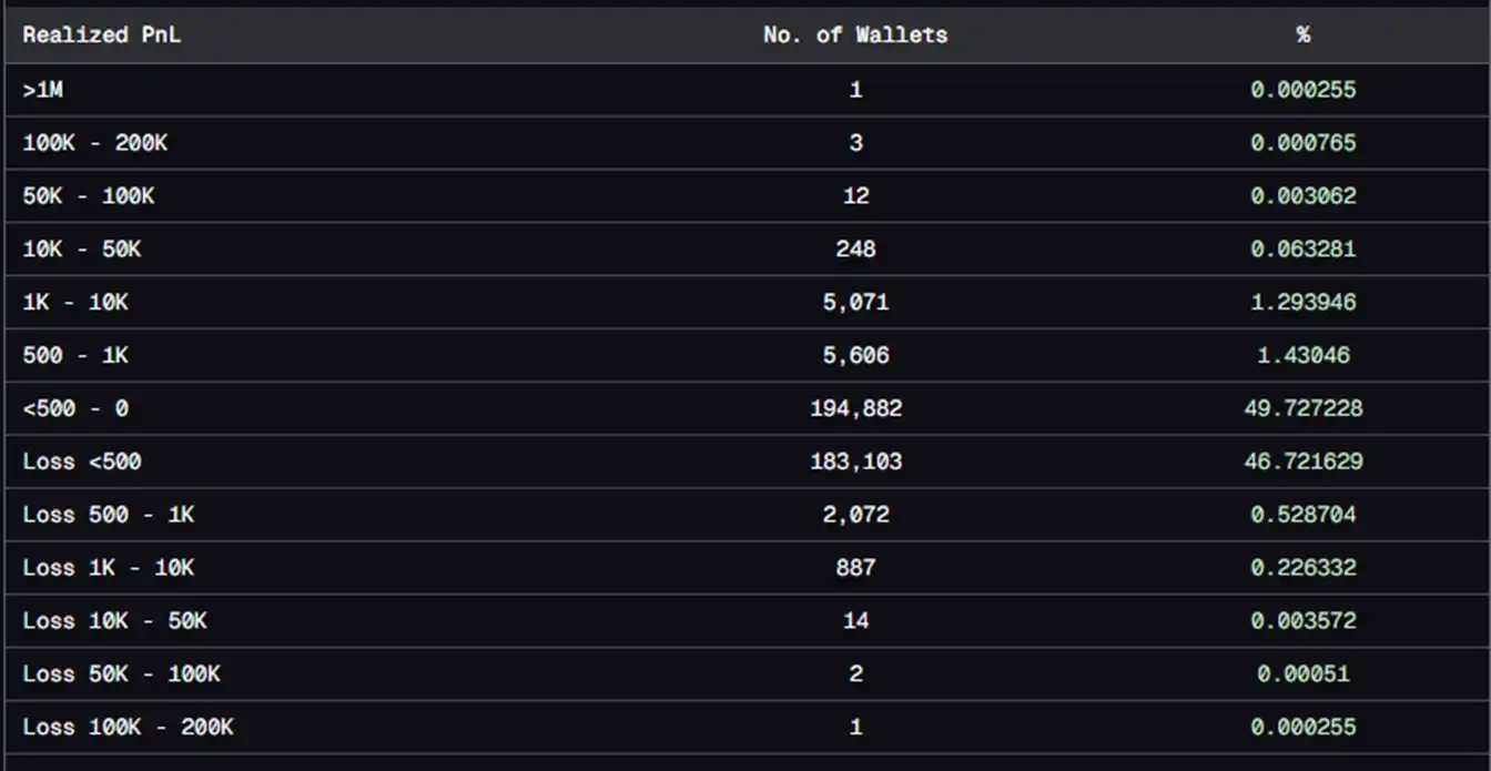 而本月對 pump.fun 用戶的交易情況統計中,有約 47.5% 的用戶處於虧損,約 49.7 的用戶只兌現了不超過 500 美元的利潤。如果能夠兌現出 500 美元以上的利潤,你就已經是市場上前 1.36% 的佼佼者。