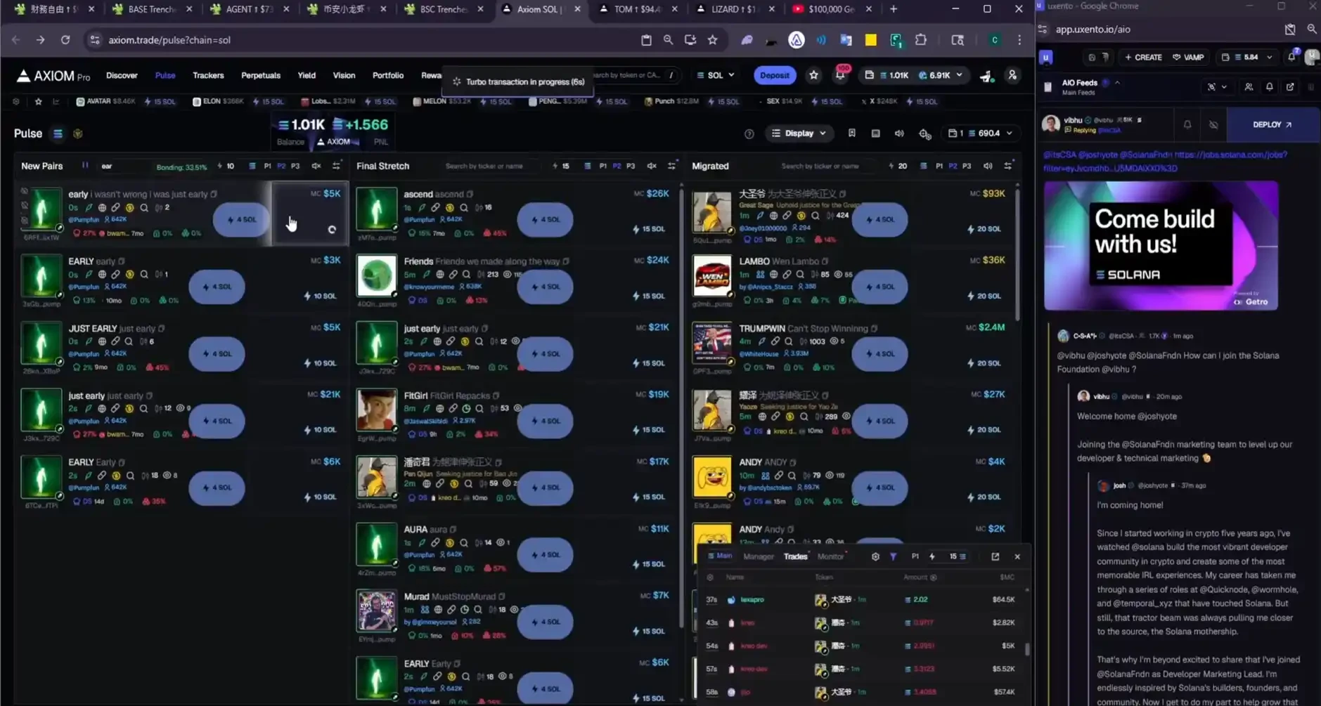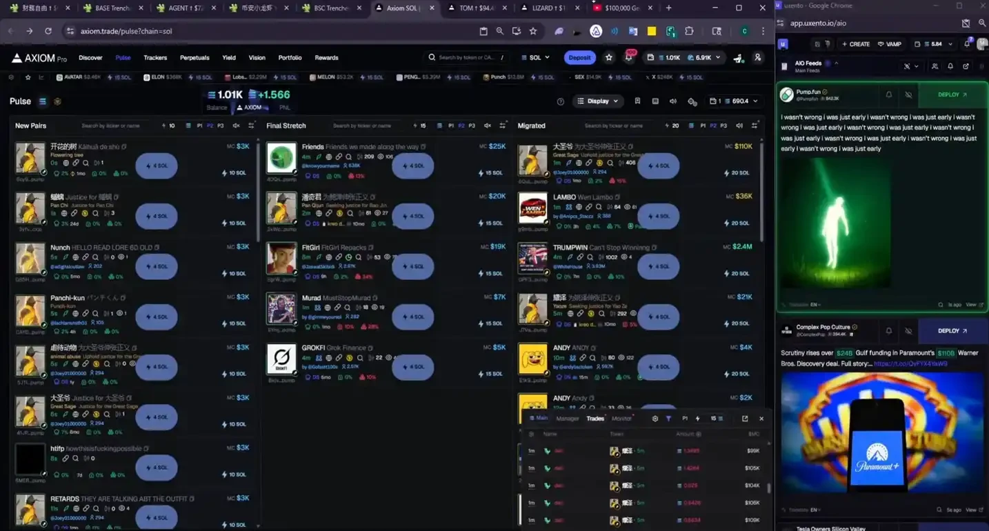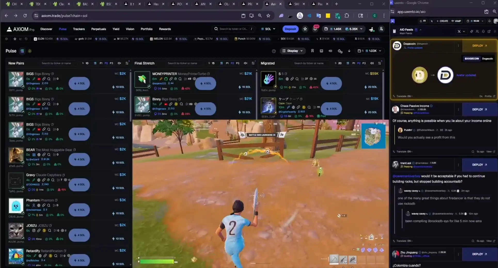 他立馬切出遊戲,還沒來得及搜尋可能的 ticker,新代幣監控中就已經跳了出來,於是果斷買入。這個切掉遊戲畫面到買入的動作,又是僅用了 2 秒鐘。放棄一場堡壘之夜遊戲到加入一場 meme 幣遊戲後,他一路賣賣賣,又收穫了 5000 美元。
