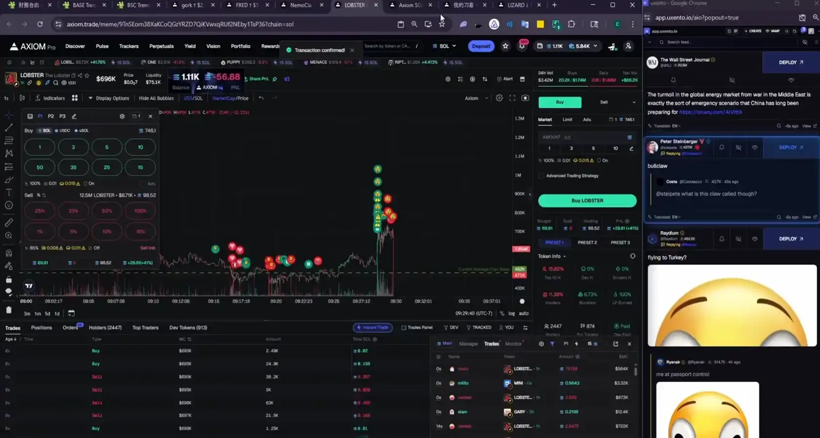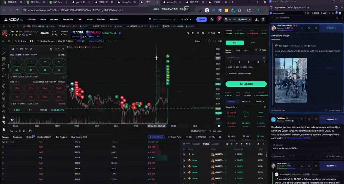 先是「龍蝦」創始人引用了一條「華爾街有龍蝦」的推文,他立即根據推文關鍵詞,選中了 $LOBSTER 這個標的並買入: