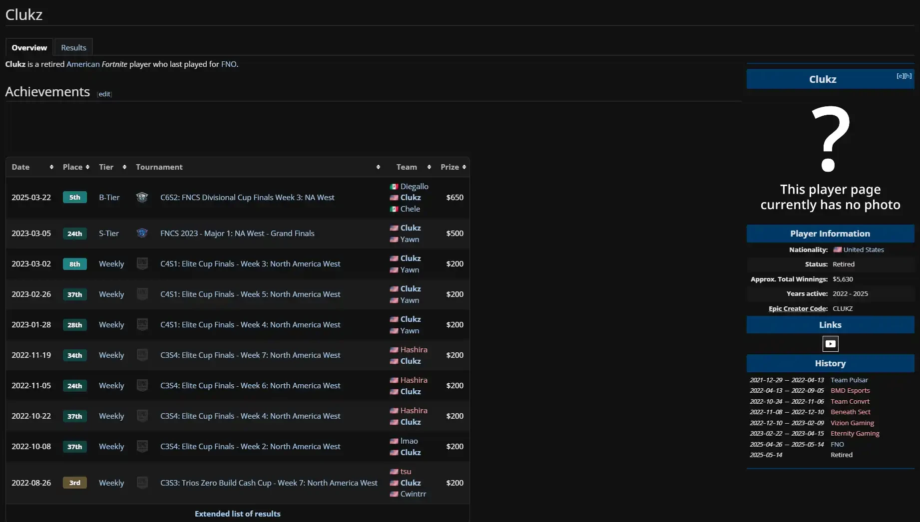 在 2021 年至 2025 年間,他曾為 7 支不同的戰隊效力。作為曾經的堡壘之夜職業選手,他的職業生涯並不算成功,生涯累計總獎金只有 5630 美元。他曾參加過 S 級別的區域性賽事,但最好成績也只有第 24 名。在相當多的小型週賽上,他也從未奪冠,最好成績只有季軍。
