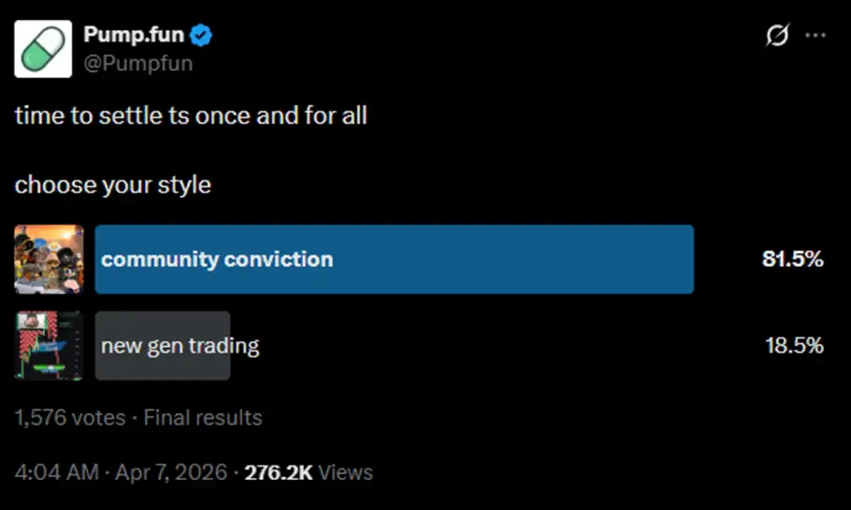 在 pump.fun 官推發起的最新投票裡,「社區信念」仍然以壓倒性的優勢獲勝。大家都懷念過去那個有趣也簡單、拿著 meme 幣可以安心入睡的時代。