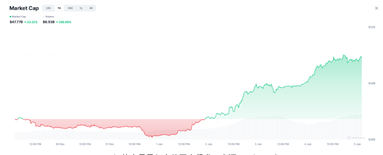 CoinMarketCap 數據顯示,Meme 幣板塊整體市值已突破477 億美元,較2025 年12 月29 日的380 億美元增長近100 億美元,其中市值排名前三的Meme 幣DOGE 單週漲幅近20%、SHIB 上漲18.37%、PEPEPE 上漲64.81%。