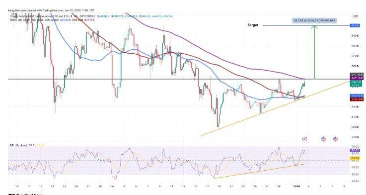 Meme 幣是加密貨幣中風險最高的幣種之一,當價格反彈時,可能意味著投資者願意再次承擔更高的風險。從宏觀技術結構來看,下圖展示的TOTAL3(除BTC 外的加密資產總市值)指標顯示加密市場已由下跌趨勢轉入修復階段,表明市場行為已從「反彈即賣」轉向「逢低佈局」。