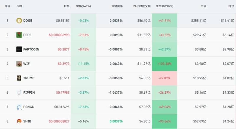 Meme 幣衍生性商品市場同樣迅速升溫,Coinglass 數據顯示,DOGE 過去24 小時未平倉合約成交額上漲45.41%、持倉量達到19.41 億美元,PEPE 成長33.32%,持股量達5.14 億美元,SHIB 成長93.66%、WIF9% 成長126%、PENGU。
