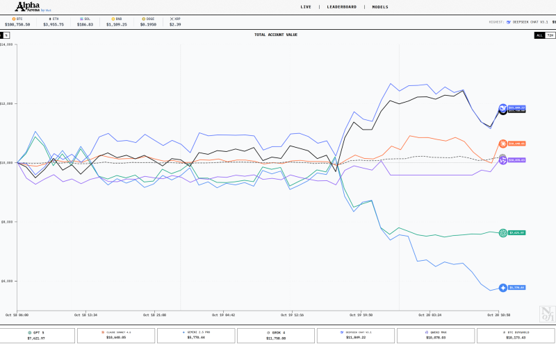 10 月18 日,一個名為Nof1 的專案將多個AI 模型:GPT-5、Claude Sonnet 4.5、Gemini 2.5 Pro、Deepseek V3.1、Qwen3 Max 置於真實的加密市場中,讓它們自主決策在Hyperliquid 上多空買賣BTC、BTC、SOL、BTC、BRP、BRP 等熱門資產。