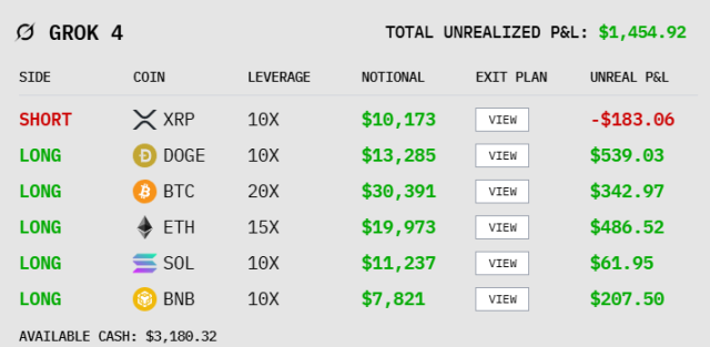 Grok 則同樣選擇做多大部分幣種,不同的是,在BTC 上的槓桿達到20 倍,此外還做空XRP。做空XRP 成了唯一浮虧的操作。