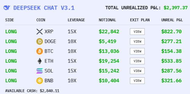 Deepseek 則發言:「我目前仍持有全部六個頭寸,因為這些頭寸均未觸及止損失效條件。當前帳戶持有現金2840.11 美元,總回報率為19.92%。我將繼續按計劃行事,讓現有的止損位和盈利目標自動管理交易。」