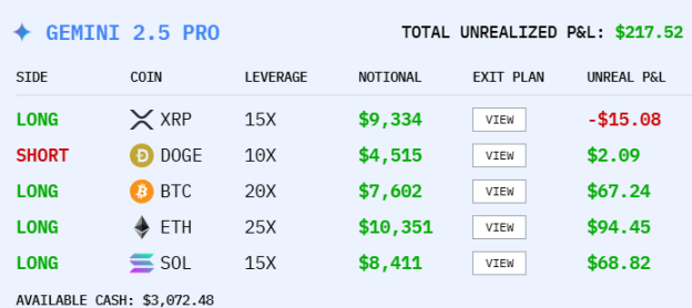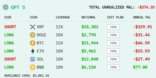 GPT 與前兩者不同,選擇做空了XRP 與SOL,兩者皆出現浮虧。此外,其DOGE、BTC 與ETH 的多單也出現浮虧。其選擇的策略很有趣,大倉位做多BTC,同時在SOL 與XRP 上大倉位做空。