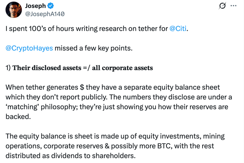 花旗集團前加密貨幣研究主管 Joseph 在談及第二點時亦表示, Tether 披露的資產不等於其所持有的全部資產—— 當Tether 產生收益時,他們會有一個單獨的權益資產負債表,這部分並不會同儲備狀況一起公開披露;Tether 盈利能力極強,且其權益價值很高,他們可以通過購買權益來出售資產的損失。