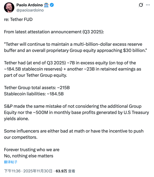 昨日晚間,隨著相關FUD 的發酵,Tether 執行長Paolo Ardoino 於發文回應表示,截至2025 年第三季末, Tether 擁有約70 億美元的超額權益(在約1845 億美元穩定幣儲備之外),以及額外約230 億美元的留存收益,它們一同構成Tether 集團的自有權。