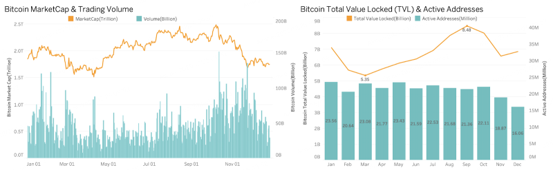 鏈上數據層面,比特幣市值在上半年隨行情快速擴張並維持高位,三季高位震盪,第四季受系統性風險衝擊明顯回落,顯示價格中樞抬升的同時波動顯著加大。交易量主要集中在趨勢轉折點和劇烈波動階段,尤其在快速下跌時放量突出,反映比特幣作為加密市場核心流動性載體的地位。