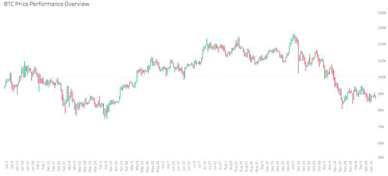 2025年,比特幣價格呈現高位震蕩的走勢。年初,比特幣在短暫沖高至109,000美元後,因美國關稅政策引發市場不確定性迅速回調至74,000美元。隨後,市場敘事轉向聯準會的降息預期,推動比特幣在3月至7月間走出強勁的單邊上漲行情,價格從約80,000美元攀升至125,000美元附近。