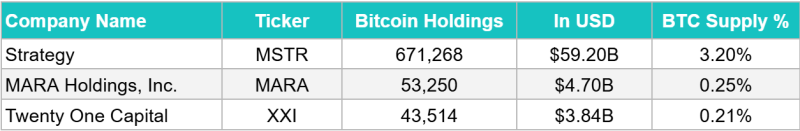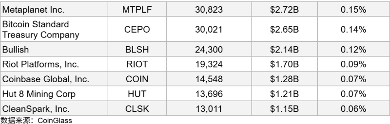 2025年BTC DATs儲備數據顯示,上市公司在比特幣配置上呈現明顯分層。 Strategy以約671,268枚BTC位居首位,佔流通量約3.20%,儘管市場深度回調,仍持續增持以鞏固市場定位。但其股票相對比特幣持股的估值顯著壓縮,mNAV降至約1.08倍,處於近年低位,反映市場對其「比特幣代理股」屬性的信心下降。整體來看,頭部BTC DATs公司具備策略優勢,但也面臨高估值波動風險。單一依賴BTC儲備的模式具備高beta特徵,在上漲週期放大收益,在震盪或下行階段則放大虧損與估值折價壓力。相較之下,業務多元化的公司(如Coinbase)則表現出更強的風險緩衝能力。