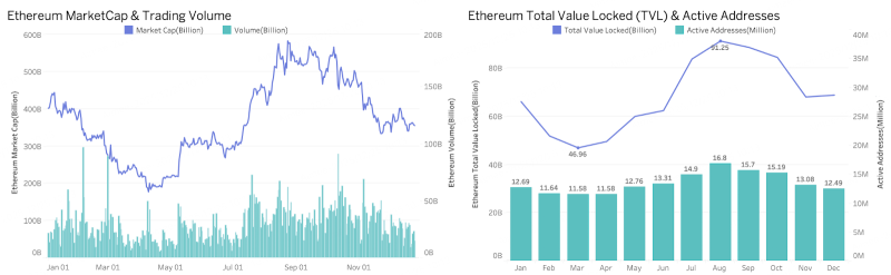 年初ETH市值自4,440億美元的高點持續回落,並在4月觸及年度低點約1774億美元,同期鏈上TVL與活躍地址數同步下滑,顯示市場信心不足、生態活躍度明顯降溫。 7月起,BitMine與SharpLink等企業開始將以太坊納入公司級策略儲備,同時以太坊ETF資金大幅流入,7月單月淨流入達54.3億美元,直接推動ETH價格在8月升至全年高點約4953美元。資金集中湧入帶來了顯著的財富效應與虹吸效應,市值與TVL同步快速抬升,TVL在8月達到912億美元的年度峰值,活躍地址數亦攀升至1680萬,表明價格上漲已向鏈上應用層傳導,生態活力階段性被激活。進入下半年後,市場由此前的單邊上漲逐步轉向高位震盪並演化為深度回調,在10月11日加密市場遭遇歷史級黑天鵝事件衝擊後,以太坊價格出現明顯下挫。至12月,ETH市值回落至約3,400億美元,價格早已跌破頭部DATs企業的主要建倉成本區間,同時以太坊ETF連續兩個月出現資金淨流出。物價與資金面的雙重走弱進一步傳導至鏈上層面,鏈上月活躍地址數快速下滑至834萬,較8月高點近乎腰斬,反映出市場風險偏好顯著收縮,投機資金與部分活躍用戶階段性撤離,以太坊生態在短期內承受了較為明顯的去槓桿與降溫壓力。