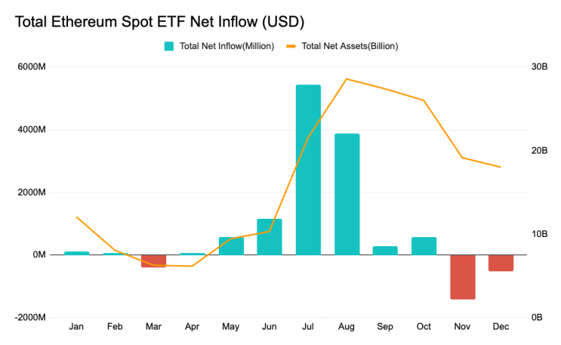2025年ETH現貨ETF資金流動呈現明顯的階段性與高波動特徵。年初資金小幅流入後,3月在市場不確定性上升背景下出現明顯流出,反映出早期資金的謹慎態度。進入第二季後5月和6月資金流入顯著增加,尤其6月淨流入約11.6億美元,紐約ETF總淨資產重回100億美元以上,顯示機構與長期資金在價格穩定或反彈階段重新加碼。 7月與8月更是出現爆發式淨流入,分別達到約54.3億美元與38.7億美元,帶動ETH ETF總淨資產攀升至全年高點約285.8億美元,顯示在ETH價格回升後機構配置需求顯著提升。但隨後受到10.11的影響ETF出現大幅流出,尤其在11月出現約14.2億美元的淨流出拉低總淨資產至約191.5億美元。