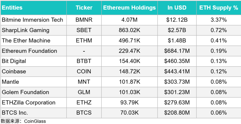 2025年ETH價格的大幅上漲與BitMine和SharpLink等企業大規模累積以太坊儲備的節奏密切相關。這些公司採取了類似先前Strategy對BTC的資產負債表累積策略,透過定向增發、私募等融資方式持續買入ETH。其中,BitMine持續擴大其ETH儲備量約407萬枚,佔ETH總供應量約3.37%,其持股價值高達121.2億美元,遠超其他公司。緊隨其後的是SharpLink Gaming與The Ether Machine,分別持有約86.30萬和49.67萬枚ETH,用於支持其流動性佈局與生態參與;Coinbase的ETH庫存在很大程度上服務於交易所運營與網絡服務需求,而非純粹的資產增值策略。整體來看,上市公司ETH持倉既有積極押注以太坊生態成長的策略性玩家,也有基於營運需求或多元資產配置的參與者,這種差異化佈局顯示ETH正被越來越多納入企業資產負債管理框架中,不再只是交易或投機標的,而是具有策略價值與生態協同作用的核心數位資產。