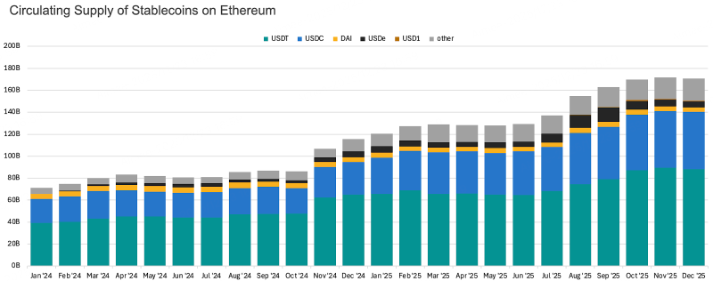 與2024年相比,2025年以太坊鏈上穩定幣流通量實現了較大幅度的上升。總流通量於下半年突破歷史高點並持續擴張,為整個DeFi與交易生態注入了前所未有的流動性深度,這直接呼應了同期ETF資金流入與市場復甦的趨勢。在結構上,形成了更穩健的雙巨頭+多元化格局:USDC憑藉其堅實的合規基礎強勢復甦,流通量顯著回升,重塑了與USDT的平衡競爭關係;而USDT則憑藉其無與倫比的網絡效應與跨鏈滲透率,繼續保持其主導份額,兩者共同構成了生態流動性的核心支柱。