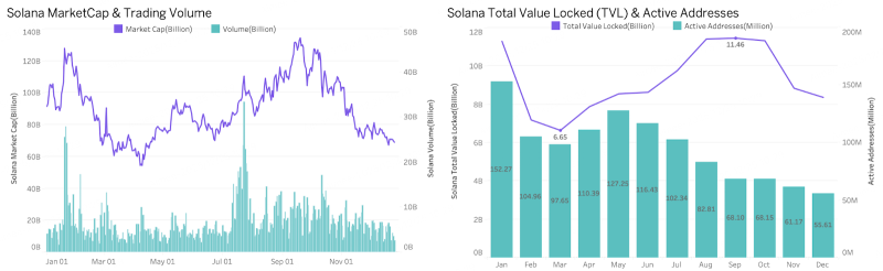 2025 年年初,SOL 在高市值和高活躍度基礎上進入回調,市值快速下滑,交易量收縮,TVL 與活躍地址數大幅下降,顯示Ai Agent Meme 熱度退潮後鏈上資金和用戶留存不足。第二季至第三季中段,SOL 迎來修復行情,市值和價格反彈,7–9 月達到全年高位,交易量明顯放大,TVL 回升至峰值,顯示資金重新流入DeFi 與鏈上應用。但活躍位址數持續走低,主要因Meme 熱度被BNB Chain 分流。四季度,SOL 進入下行與去槓桿階段,市值、交易量和TVL 回落,活躍地址數降至全年低點,鏈上參與度減弱。