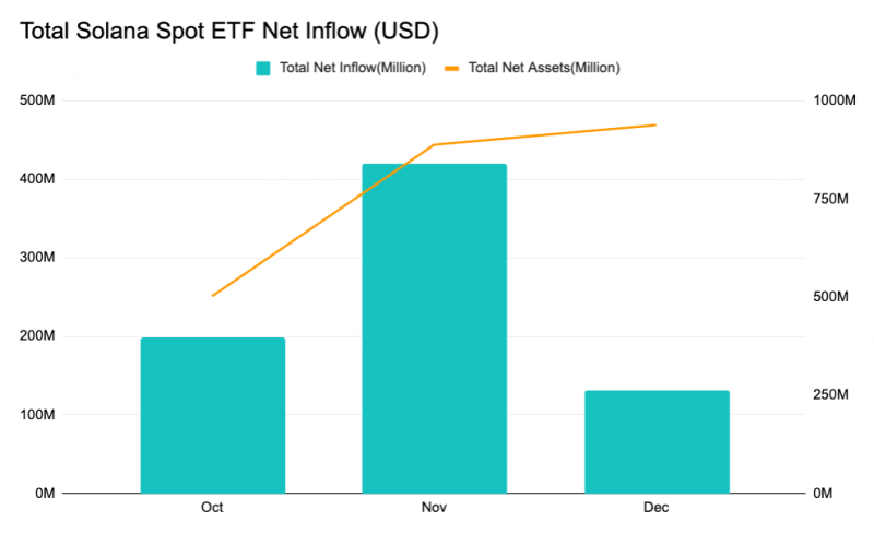 Solana現貨ETF首批產品於10月28日正式上市,截至12月,其管理資產規模已達約9.2億美元。由於上線時間較短,Solana ETF在2025年內尚未形成足夠規模的持續買盤,因此對SOL當年的價格表現提振作用相對有限。不過,從資金流向結構來看,Solana ETF仍具備一定的正面訊號:儘管SOL價格在上市後階段性走弱,ETF資金卻呈現出「越跌越買」的逆勢淨流入態勢。這顯示部分中長期資金正在低位逐步佈局Solana,為其後續價格修復和生態估值重塑埋下潛在伏筆。