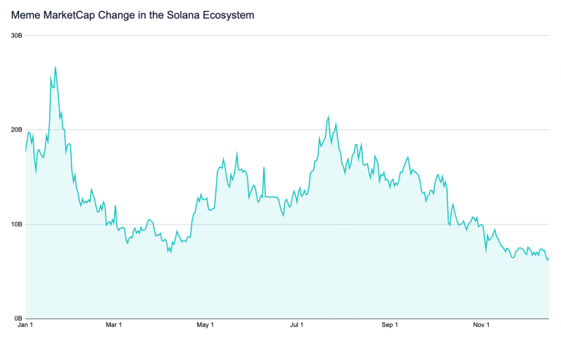 2025年Solana的價格表現相較於其他兩大主流資產顯得不如預期。年初,SOL價格從高點294美元下跌後,再未能回到前期高點。與BTC和ETH不同,這兩者在本輪週期中得益於ETF和DATs帶來的新增資金流動性,而Solana的ETF直到10月才正式上線,導致年內缺乏穩定的買盤支撐。同時,Solana持續的代幣解鎖增加了市場拋壓,加劇了價格低迷。即便8月,BTC和ETH雙雙刷新新高時,SOL仍徘徊在約253美元附近,並在隨後迅速回落。此外,Solana生態主要依賴Meme賽道相關項目市值持續縮水,且其市場份額被BNB、Base等競爭對手部分蠶食,也進一步壓制了SOL的價格表現。全年整體來看,Solana價格缺乏外部資金支持、內部生態成長受限,使其走勢明顯弱於BTC和ETH。