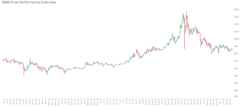 2025年對BNB而言是表現強勁的一年。其價格自4月探底約509美元後一路走高,並於10月13日突破歷史前高,觸及1,370美元,階段漲幅超過169%。本輪上漲主要得益於幣安生態的持續建設與市場運營的有效推動:幣安Alpha上線吸引了大量用戶參與,同時創始人CZ與聯合創始人何一憑藉其行業影響力,在推特中積極營造話題,成功帶動了BNB Chain上Meme板塊的活躍——例如“MemeMeme”、“關注貨幣