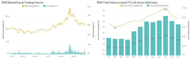 鏈上基本面方面,TVL 於10 月見頂約83.6 億美元後回落,活躍地址數同期創下約8,285 萬的高點,顯著高於同期Solana。儘管12 月TVL 回落至約65 億美元、活躍度有所降溫,但整體仍明顯高於年中水平,顯示BNB Chain 已完成一次用戶與流動性基數的整體抬升。