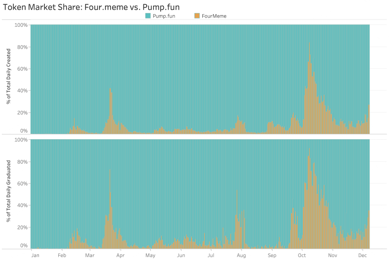 年初,Solana鏈上的Pump.fun佔據主導,但自第二季度起,BNB Chain生態內的FourMeme平台份額持續攀升並於下半年實現了反超併確立領先。這一變化直接對應了Solana與BNB Chain兩條公鏈在2025年的命運交錯:Solana在Ai Agent Meme熱度退潮後,鏈上真實資金與用戶留存不足的問題暴露,活躍地址數持續走低,資金與注意力被BNB Chain搶佔;而BNB Chain則通過各類幣安題材的Memem與注意力被BNB Chain搶佔;而BNB Chain則通過各類幣安題材的結果跨越了歷史性。