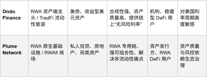 這項轉變的核心驅動力是「收益疊加」 的投資邏輯。市場關注點不再是“能否上鍊”,而是“上鍊後如何高效組合”。透過將RWA資產(如美債的固有收益)與DeFi協議(如借貸、質押)結合,實現了「現實世界原生收益+ 鏈上金融收益」的雙輪驅動,極大提升了資本效率。在此邏輯下,賽道演化出兩類互補的核心玩家:以Ondo Finance 為代表的資產端,專注於提供合規、安全的標準化收益資產(如代幣化國債),充當傳統流動性入口;以Plume Network 為代表的基礎設施端,則致力於構建RWA原生的專用執行環境,透過交易、交易與DeFi組合,可解決非標性的流動性。二者共同推動RWA向一個兼具機構級品質與鏈上可編程性的「Web3華爾街」 演進。展望未來,隨著監管框架的進一步成熟,RWA賽道有望與高性能DeFi平台深度融合,成為其最重要的資產來源,並孕育出更複雜的鏈上衍生品與結構化產品。