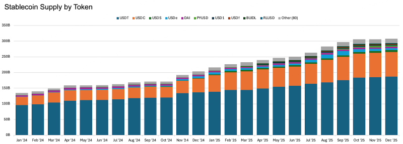 2025年是穩定幣賽道的歷史性分水嶺。隨著美國《GENIUS法案》與歐盟MiCA等關鍵監管框架落地,穩定幣徹底告別「灰色金融工具」身份,進入高度合規化與制度化的競爭新紀元。其角色也發生根本性演變:從加密市場內部的交易媒介,升級為整個鏈上金融體系的基礎貨幣層。在這一背景下,穩定幣市場在2025年呈現總量躍升與結構重塑的雙重特質。從總量來看,流通量較2024年達到顯著成長。這固然得益於全球貨幣政策的轉向寬鬆,但最直接的驅動力是監管破冰。明確的法律架構消除了傳統金融機構的合規疑慮,吸引了大規模機構資金進入。