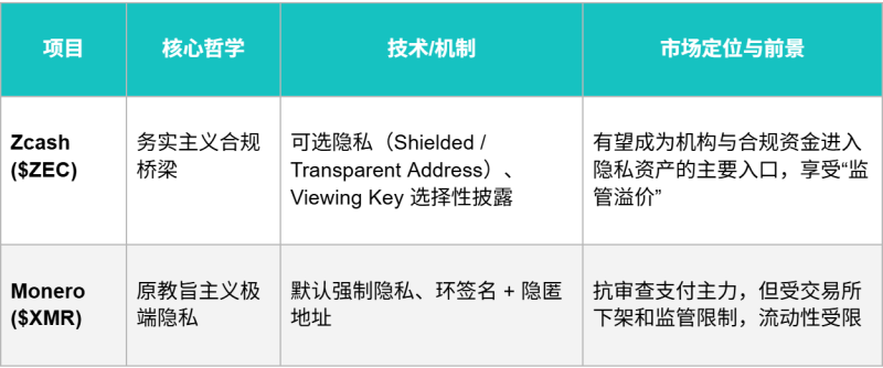 2025 年,隱私賽道內部出現了清晰的路線分化,以Zcash與Monero為代表的兩大隱私幣走向完全不同的生態位。 Zcash 的優勢在於“可被監管理解”,以犧牲部分純粹性換取制度內生存空間;Monero 的優勢在於“不可審查”,但合規市場幾乎關閉,流動性高度受限。隱私幣的競爭,已從技術之爭演變為生存策略之爭。