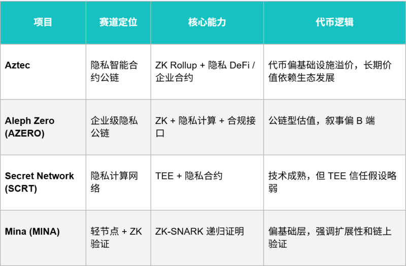如果說隱私幣主要解決“個人轉帳隱私”,2025 年真正打開長期天花板的是零知識證明(ZK)驅動的隱私基礎設施賽道。這一分支不強調完全匿名,而強調“可驗證但不可見”,更適合機構、RWA 與企業級金融場景。 ZK 隱私路線的核心優勢在於不與監管正面衝突,可服務RWA、企業結算和隱私DeFi,更容易被TradFi、機構與政府體系接納。但其劣勢在於技術複雜度高、開發成本大,用戶體驗仍弱於傳統鏈,代幣價值捕獲路徑仍在早期。