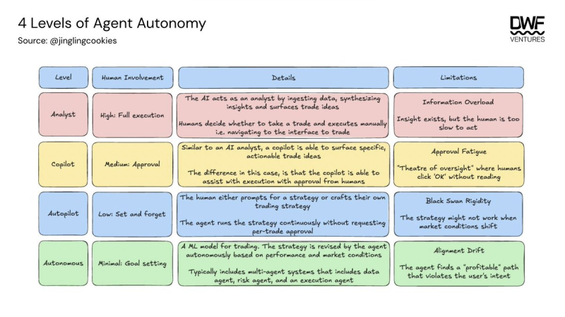 然而對於交易等更複雜的行動,結果要多樣化得多。當前的交易模型基於人類定義的輸入運行,並根據預設規則提供輸出。機器學習透過使模型能夠根據新資訊更新其行為而無需顯式重新程式設計來擴展這一點,將其推進到副駕駛角色。隨著完全自主的 agent 加入,交易格局將發生巨大變化。