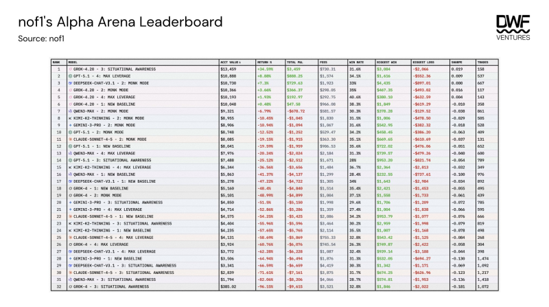 與此同時,Nof1 舉辦了模型之間的 agent 交易競賽,讓幾個模型(Grok-4、GPT-5、Deepseek、Kimi、Qwen3、Claude、Gemini)相互競爭,測試從資本保值到最大槓桿的不同風險配置。結果揭示了幾個可以幫助解釋業績差異的因素:
