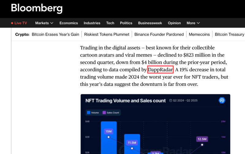 許多Web3 產業新人或許不清楚,DappRadar 曾經是一個非常重要且權威的資料來源。除了諸如CoinDesk 和中文Web3 媒體的引用,包括彭博社、《富比士》、BBC 等傳統歐美主流媒體也曾多次引用DappRadar 數據。