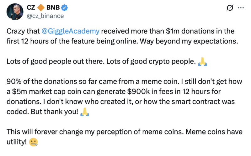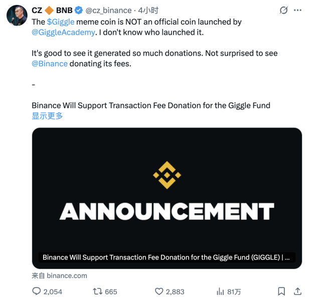 9 月21 日,Giggle Academy 宣布開始以加密貨幣的形式接收公眾捐贈,以幫助更多孩子們獲得免費、高品質的教育。 GiggleFund 藉此機會推出了GIGGLE,並宣布將所有GIGGLE 交易費用捐贈給Giggle Academy。這絕佳的切入角度讓GIGGLE 快速實現了爆發,Giggle Academy 在開放捐贈12 小時後快速收到了超100 萬美元的捐贈,其中約90% 來自於GIGGLE 交易的手續費。 CZ 就此曾專門發文稱讚“這改變了自己對Meme 代幣的看法,展現Meme 代幣的實際用途”,進一步奠定了GIGGLE 在BSC 生態的頭部地位。