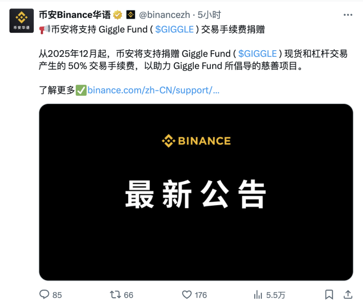 11 月3 日17:06,社區的期待的終於落地—— 幣安官方發佈公告表示從12 月起將把GIGGLE 現貨和槓桿交易產生的50% 手續費捐贈給Giggle Fund 支持的慈善項目。受此利好刺激,GIGGLE 從70 美元左右快速上沖至最高113.99 美元,短線一度大漲超60%。