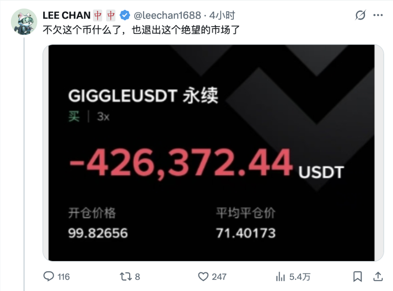 更糟的是,許多用戶在幣安公告出台之際選擇了出手追漲,情緒急轉導致許多人直接被套甚至爆倉。知名鏈上交易員0xSun 揭露自己因此虧損98 萬美元,並直言對BSC 生態的失望;另一位中文區知名KOL Lee Chan 也揭露自己因此虧損42.6 美元。