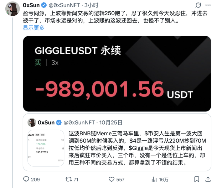 但並非只有正面的情緒會被放大,在10 月11 日史詩級大爆倉之後,市場流動性快速縮緊,散戶情緒高度緊繃,攻守之勢早已異也。就像今日關於GIGGLE 的發言,CZ 的想法可能只是像10 月25 日 Giggle Academy 官方澄清時那樣做個聲明,但流動性本就吃緊的市場卻直接應激,進而造成了生態的集體下跌。
